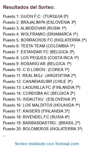 Lista de participantes: ALTZIBAR, TESTA TEAM, ROSARIO AR, CAMAROD, LOS PEQUES, LOS MALDITOS, BRAJALIMPA, CORDOBA AC, GIJON F.C, KAISERS, LAGUNILLA FC, CANARIASLIBR, ROBERMAHONES, VINDEOVER, BORRACHOS FC, BOLOMEROS, RIVENDEL FC, ROINTE UD, REAL MGJ, ESTANDAR FC, WOLFRAMIO, C.D.LOBON, INDAUTXU, BARBASDASTRO, ALMODOVAR.