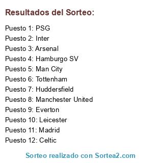 Lista de participantes: Manchester United, Tottenham, Huddersfield, Everton, Leicester, Arsenal, Madrid, PSG, Inter, Hamburgo SV, Celtic, Man City.