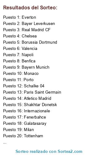 Lista de participantes: Real Madrid CF, FC Barcelona, Atletico Madrid, Sevilla, Valencia, Chelsea, Liverpool, Arsenal, Manchester City, Tottenham, Manchester United, Fulham, Everton, Borussia Dortmund, Bayern Munich, Bayer Leverkusen, Schalke 04, Milan, Roma, Napoli, Internazionale, Juventus, Fiorentina, Paris Saint Germain, Monaco, Olympique Marsella, Olympique Lyon, Shakhtar Donetsk, Fenerbahce, Galatasaray, Porto, Benfica.