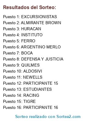 Lista de participantes: NEWELLS, QUILMES, ALMIRANTE BROWN, TIGRE, INSTITUTO, RACING, DEFENSA Y JUSTICIA, ALDOSIVI, EXCURSIONISTAS, BOCA, ESTUDIANTES, ARGENTINO MERLO, FERRO, HURACAN, PARTICIPANTE 15, PARTICIPANTE 16.