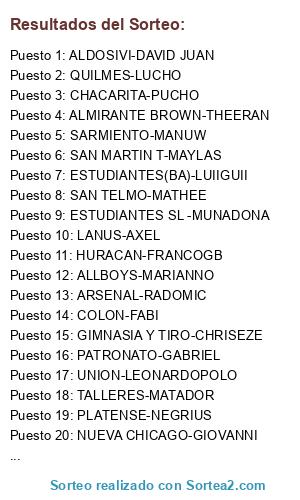 Lista de participantes: GIMNASIA Y TIRO-CHRIS EZE, PATRONATO-DARIO, SAN TELMO-MATHEE, TIGRE-CH4NO, CHACARITA-PUCHO, TALLERES-MATADOR, ARSENAL-RADOMIC, ALL BOYS-MARIANNO, YUPANQUI-JULIAN, ALDOSIVI-DAVID JUAN, ESTUDIANTES SL-PATONMDA, COLON-FABI, QUILMES-LUCHO, PLATENSE-NEGRIUS, ESTUDIANTES BA-LUIGUII, GUILLERMO BROWN-QUARENZO, TALLERES RDE-NICOTINA, FERRO-EZEQUIEL, LANUS-AXEL SANCHEZ, CIPOLETTI-GUSTAVO, ALMIRANTE BROWN-MARIANO, NUEVA CHICAGO-GIOVANNI, SAN MARTIN T-MAYLAS, VILLA DALMINE-EMIPRO, ATL TUCUMAN-KONCHA, VELEZ-JUANI, BELGRANO-JUANN, LAFERRERE-NAHU.