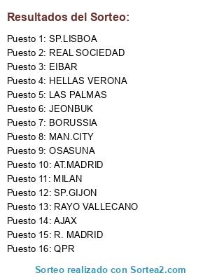 Lista de participantes: QPR, HELLAS VERONA, BORUSSIA, RAYO VALLECANO, MILAN, OSASUNA, AJAX, SP.LISBOA, MAN.CITY, AT.MADRID, R. MADRID, LAS PALMAS, REAL SOCIEDAD, EIBAR, JEONBUK, SP.GIJON.