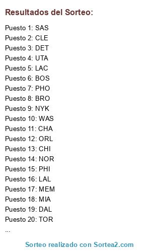 Lista de participantes: BRO, LAC, MEM, MIL, POR, SAC, NYK, PHO, PHI, BOS, CHI, ORL, CHA, DEN, MIA, OKC, DAL, SAS, IND, LAL, MIN, UTA, GSW, CLE, WAS, HOU, TOR, NOR, DET, ATL, .