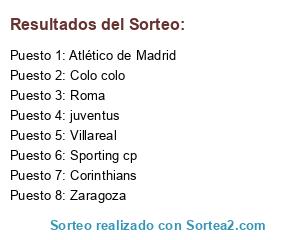 Lista de participantes: REAL MADRID, FIORENTINA, LIVERPOOL, RIVER PLATE, TOTTENHAM, GENOA, OSASUNA, EVERTON, MALAGA, CHELSEA, ALDOSIVI, COLO COLO, BAYERN MUNICH, SPORTING CP, YOKOHAMA MARINOS, JUVENTUS, PATETICO DE MADRID, LYON, ROMA, REAL ZARAGOZA, ANGERS, CORINTHIANS, BILBAO, MONACO, NAPOLES, VILLAREAL, PASA DE RONDA 1, PASA DE RONDA 2, PASA DE RONDA 3, PASA DE RONDA 4, PASA DE RONDA 5, PASA DE RONDA 6.
