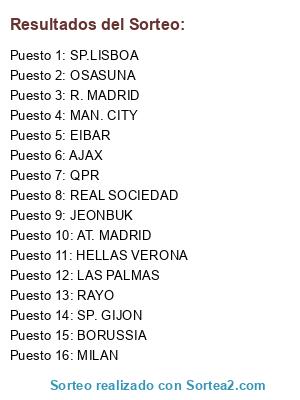 Lista de participantes: CELTA, ROMA, BENFICA, BETIS, VALENCIA, OPORTO, MAN. UNITED, BOCA JUNIORS, LIVERPOOL, MALAGA, BRUJAS, GIRONA, ALAVES, ATH. BILBAO, FC. BARCELONA, ESPANYOL.
