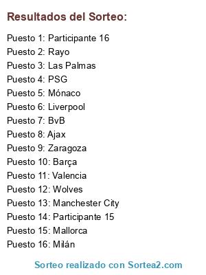 Lista de participantes: PSG, Wolves, Mallorca, Liverpool, Manchester City, Las Palmas, Valencia, Milán, Zaragoza, Mónaco, BvB, Rayo, Ajax, Barça, Participante 15, Participante 16.