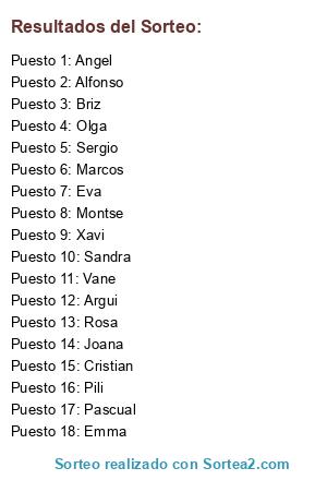 Lista de participantes: Pascual, Eva, Montse, Xavi, Rosa, Sergio, Emma, Argui, Joana, Alfonso, Vane, Briz, Olga, Angel, Pili, Sandra, Marcos, Cristian.