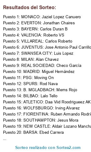 Lista de participantes: ARSENAL: Oscar Millan Sanchez, CHELSEA: Robertito Jimenez, CITY: Javier Rs, MAN U: Alex Sanchez, PSG: Moving On, DORTMUND: Oscar Ugalde, BAYERN: Carlos Duran B, JUVENTUS: Jose Antonio Paul Carrillo, BARSA: Ebed Carrera, MADRID: Miguel Hernández, ATLETICO: Daa Viid Roodrigueez AK, LEVERKUSEN: Enrique Blanco, B. MGLADBACH: Mems Rojo, SHALKE04: Alexis Gonzalez Ochoa, WOLFSBURGO: Irving Alvarez, MONACO: Jaziel Lopez Canuero, MARSELLA LYON: Mike Padu, BILBAO: Lalo Tello, REAL SOCIEDAD: Checo García, SEVILLA: Adrian Antonio Tejeda Velázquez, VALENCIA: Roberto VS, VILLAREAL: Carlos Roberto, EVERTON: Jonathan Chaires, LIVERPOOL: Omar Garcia, NEW CASTLE: Aldair Lozano Mancha, SOUTHAMPTON: Jesus Mora, SPURS: Rod Nava, STOKE CITY: Angel Fdez, SWANSEA CITY: Luis Lopez, MILAN: Alan Chavez, FIORENTINA: Ruben Armando Rodríguez, INTER: David Garcia.