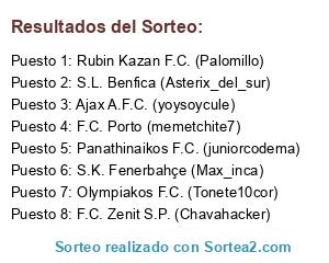 Lista de participantes: S.L. Benfica (Asterix_del_sur), F.C. Porto (memetchite7), Panathinaikos F.C. (juniorcodema), Ajax A.F.C. (yoysoycule), Olympiakos F.C. (Tonete10cor), S.K. Fenerbahçe (Max_inca), F.C. Zenit S.P. (Chavahacker), Rubin Kazan F.C. (Palomillo).