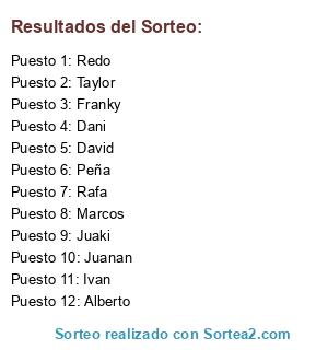 Lista de participantes: Juaki, Redo, Marcos, Rafa, David, Franky, Ivan, Alberto, Juanan, Peña, Dani, Taylor.