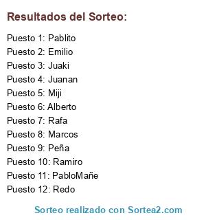 Lista de participantes: Rafa, Alberto, Redo, Pablito, PabloMañe, Peña, Miji, Juaki, Emilio, Juanan, Marcos, Ramiro.