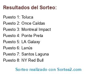 Lista de participantes: NY Red Bull, Ponte Preta, Toluca, Once Caldas, Santos Laguna, Lanús, Montreal Impact, LA Galaxy.