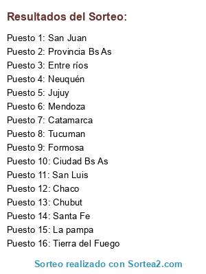 Lista de participantes: San Luis, Mendoza, Santa Fe, Catamarca, Tierra del Fuego, Entre ríos, San Juan, Neuquén, Formosa, La pampa, Ciudad Bs As, Provincia Bs As, Chubut, Chaco, Jujuy, Tucuman.