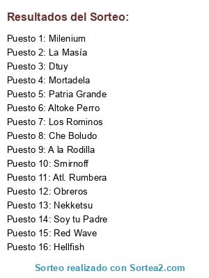 Lista de participantes: Milenium, Dtuy, Altoke Perro, Soy tu Padre, Nekketsu, Patria Grande, A la Rodilla, Hellfish, Che Boludo, La Masía, Los Rominos, Atl. Rumbera, Red Wave, Mortadela, Obreros, Smirnoff.