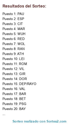 Lista de participantes: RED, LCE, ARS, LEV, MAR, DOR, VAL, VIL, WUH, PSG, RAN, ROM, VIG, TOT, ESP, WAT, WOL, SHE, ATH, CIT, PAU, BAY, BET, BAR, UNI, GIR, LEI, DEP/RAYO.