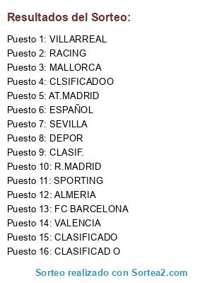Lista de participantes: FC BARCELONA, SEVILLA, ALMERIA, ESPAÑOL, VILLARREAL, AT.MADRID, R.MADRID, VALENCIA, RACING, MALLORCA, DEPOR, SPORTING, CLASIFICADO, CLASIF., CLASIFICAD O, CLSIFICADOO.