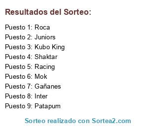 Lista de participantes: Kubo King, Shaktar, Roca, Juniors, Gañanes, Racing, Patapum, Mok, Inter.