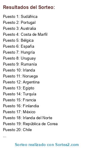 Lista de participantes: Alemania, Argentina, Bélgica, Brasil, Costa de Marfil, Croacia, España, Francia, Holanda, Inglaterra, Italia, Portugal, Rusia, Uruguay, Australia, Austria, Bulgaria, Camerún, Chile, Colombia, Dinamarca, Ecuador, Egipto, Escocia, Eslovenia, USA, Finlandia, Grecia, Hungría, Irlanda, Irlanda del Norte, México, Noruega, Nueva Zelanda, Perú, Polonia, República de Corea, Rumanía, Sudáfrica, Suecia, Suiza, Turquía.