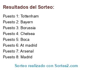 Lista de participantes: Borussia, Chelsea, Madrid, Tottenham, Juve, Roma, Arsenal, River, United, Milán, City, PSG, AJAX, Liverpool, Marsella, Inter.