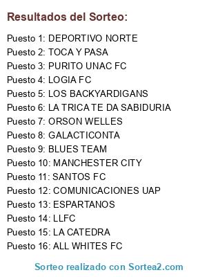 Lista de participantes: GALACTICONTA, LOS BACKYARDIGANS, LA TRICA TE DA SABIDURIA, PURITO UNAC FC, BLUES TEAM, MANCHESTER CITY, ORSON WELLES, LA CATEDRA, ESPARTANOS, DEPORTIVO NORTE, COMUNICACIONES UAP, LOGIA FC, LLFC, ALL WHITES FC, TOCA Y PASA, SANTOS FC.