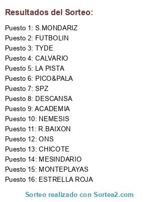 Lista de participantes: ONS, CHICOTE, SPZ, ESTRELLA ROJA, CALVARIO, S.MONDARIZ, MESINDARIO, FUTBOLIN, TYDE, R.BAIXON, ACADEMIA, MONTEPLAYAS, LA PISTA, NEMESIS, PICO&PALA, DESCANSA.