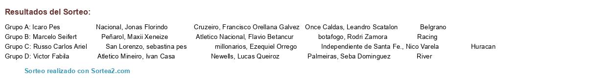 Lista de participantes: Lucas Queiroz Palmeiras, Victor Fabila Atletico Mineiro, Flavio Betancur botafogo, Ivan Casa Newells, Nico Varela Huracan, Russo Carlos Ariel San Lorenzo, Jonas Florindo Cruzeiro, Marcelo Seifert Peñarol, Francisco Orellana Galvez Once Caldas, Icaro Pes Nacional, Rodri Zamora Racing, sebastina pes millonarios, Leandro Scatalon Belgrano, Seba Dominguez River, Maxii Xeneize Atletico Nacional, Ezequiel Orrego Independiente de Santa Fe..