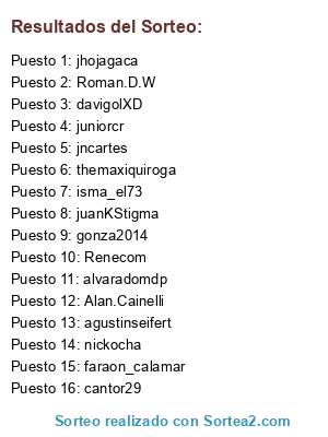 Lista de participantes: cantor29, alvaradomdp, Alan.Cainelli, juanKStigma, Renecom, juniorcr, gonza2014, davigolXD, themaxiquiroga, jhojagaca, jncartes, isma_el73, faraon_calamar, Roman.D.W, agustinseifert, nickcha.