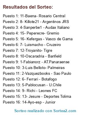 Lista de participantes: 1-Fabianorz - AT.Panaraense, 2-Vazquezbooks - Sao Paulo, 3-Luis Belloto- Palmeiras, 4-Sanperbe1 - Audax Italiano, 5-Pablocusan - U.Chile, 6- Ferrari - Botafogo, 7- Luismacho - Cruzeiro, 8- Killote21 - Argentinos JRS, 9- Richi - Leones FC, 10-Oscaradria - Banfield, 11-Baena- Rosario Central, 12-Troyanito- Tigre, 13- Jesure - Deportes Tolima, 14-Ayo-esp - Junior, 15- Peperecre- Gremio, 16- Kefergas - Vasco de Gama.