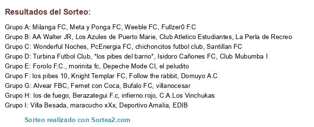 Lista de participantes: Alvear FBC, Santillan FC, Weeble FC, Club Mubumba I, Knight Templar FC, La Perla de Recreo, Fernet con Coca, Los Azules de Puerto Marie, Turbina Futbol Club, Berazategui F.c, los de fuego, infierno.rojo, C.A.Los Vinchukas, Milanga FC, maracucho xXx, Wonderful Noches, Follow the rabbit, Fullzer0 F.C, Bufalo FC, chichoncitos futbol club, Villa Besada, Meta y Ponga FC, Depeche Mode CI, Deportivo Amalia, los pibes 10, Club Atletico Estudiantes, Forolo F.C., *los pibes del barrio*, PcEnergia FC, Domuyo A.C, villanocesar, AA Walter JR, EDIB, morinita fc, Isidoro Cañones FC, el peludito.