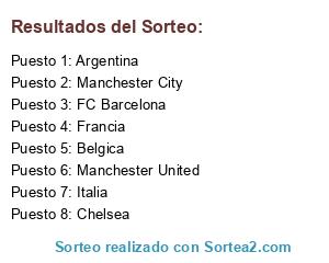 Lista de participantes: Manchester City, Belgica, Chelsea, Italia, FC Barcelona, Francia, Argentina, Manchester United.