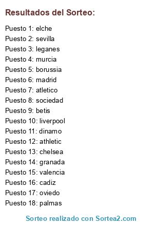 Lista de participantes: atletico, dinamo, betis, madrid, athletic, leganes, murcia, sevilla, valencia, granada, elche, palmas, sociedad, borussia, oviedo, cadiz, chelsea, liverpool.