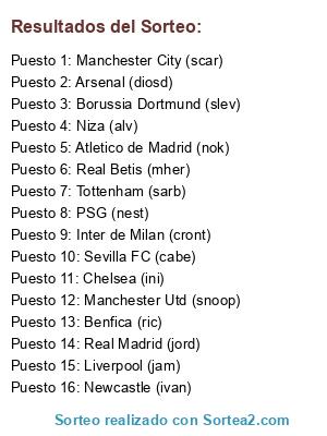 Lista de participantes: Borussia Dortmund (Jordi), Atlético Madrid (Albert), Leipzig (Mher), Real Betis (Cront), Man United (Nokio), Benfica (Ric), PSG (Sarbi), Shaktar (Nestor).