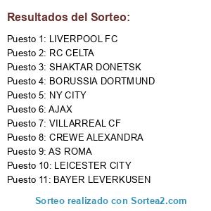 Lista de participantes: LIVERPOOL FC, LEICESTER CITY, CREWE ALEXANDRA, BORUSSIA DORTMUND, BAYER LEVERKUSEN, RC CELTA, VILLARREAL CF, AS ROMA, AJAX, NY CITY, SHAKTAR DONETSK.