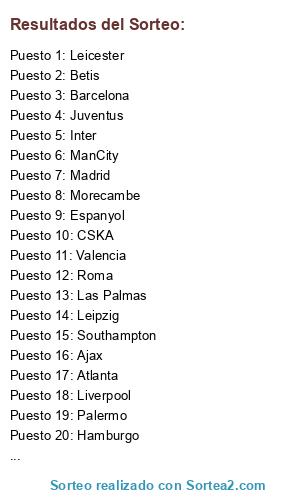 Lista de participantes: Bayern, Leicester, Roma, Las Palmas, ManUnited, Morecambe, ManCity, Leipzig, Atlanta, Fiorentina, Ajax, Juventus, Levante, Sporting, Betis, CSKA, Palermo, Milan, Barcelona, Mallorca, Southampton, Espanyol, BvB, Inter, Liverpool, Hamburgo, Lyon, Valencia, Madrid, Atletico.