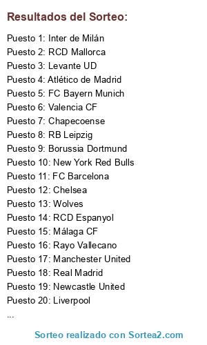 Lista de participantes: Inter de Milán, PSG, Wolves, FC Bayern Munich, Borussia Dortmund, Valencia CF, RCD Mallorca, Newcastle United, Manchester United, Málaga CF, Chapecoense, Levante UD, Liverpool, Chelsea, Manchester City, Real Madrid, RB Leipzig, Rayo Vallecano, Milan, New York Red Bulls, FC Barcelona, RCD Espanyol, Sevilla FC, Atlético de Madrid.