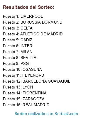 Lista de participantes: MILAN, BARCELONA GUAYAQUIL, FIORENTINA, ATLETICO DE MADRID, REAL MADRID, CADIZ, CELTA, LYON, BORUSSIA DORMUND, INTER, ZARAGOZA, FEYENORD, SEVILLA, PSG, OSASUNA, LIVERPOOL.