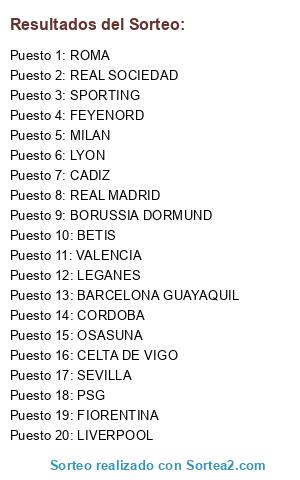 Lista de participantes: CORDOBA, REAL MADRID, ROMA, FIORENTINA, CELTA DE VIGO, CADIZ, BARCELONA GUAYAQUIL, MILAN, LEGANES, PSG, FEYENORD, VALENCIA, LYON, REAL SOCIEDAD, OSASUNA, BETIS, SEVILLA, LIVERPOOL, SPORTING, BORUSSIA DORMUND.