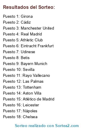 Lista de participantes: Atlético de Madrid, Athletic Club, Las Palmas, Tottenham, Nápoles, Manchester United, Betis, Girona, Cádiz, Real Madrid, Sevilla, Bayern Munich, Rayo Vallecano, Udinese, Aston Villa, Chelsea, Eintracht Frankfurt, Leicester.