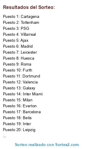 Lista de participantes: Tottenham, Ajax, River, Villarreal, Lyon, Huesca, Marsella, Valencia, Atletico de Madrid, Furth, Chelsea, Dortmund, Inter Miami, Roma, City, Inter, Liverpool, Rayo, Betis, PSG, Everton, Arsenal, Bayern, United, Leicester, Milan, Leipzig, Venezia, Barcelona, Madrid, Cartagena, Galaxy.