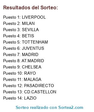 Lista de participantes: LAZIO, CHELSEA, AT.MADRID, TOTTENHAM, MALAGA, SEVILLA, MILAN, RAYO, CD.CASTELLON, BETIS, JUVENTUS, MADRID, LIVERPOOL, PASADIRECTO.