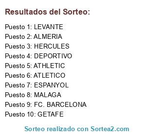 Lista de participantes: ALMERIA, ATHLETIC, ATLETICO, FC. BARCELONA, DEPORTIVO, ESPANYOL, GETAFE, HERCULES, LEVANTE, MALAGA.