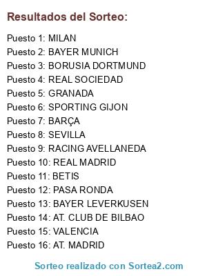 Lista de participantes: AT. MADRID, AT. CLUB DE BILBAO, SEVILLA, BETIS, GRANADA, MILAN, BARÇA, BORUSIA DORTMUND, RACING AVELLANEDA, VALENCIA, REAL MADRID, BAYER LEVERKUSEN, BAYER MUNICH, SPORTING GIJON, REAL SOCIEDAD, PASA RONDA.
