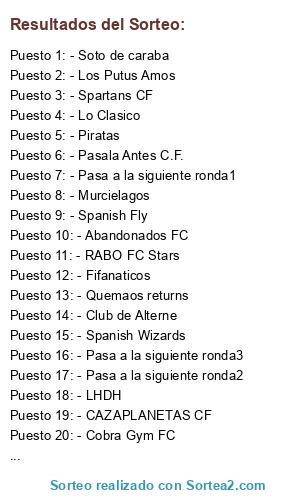 Lista de participantes: - SPK Joga Bonito, - Lo Clasico, - Piratas, - LHDH, - Eclipse, - RABO FC Stars, - Spanish xtreme, - Historicos, - Los Putus Amos, - Cani District, - MFC'08, - Spanish Wizards, - Cobra Gym FC, - Hispanicos, - Magos, - Spartans CF, - Soto de caraba, - Pasala Antes C.F., - Abandonados FC, - Isotopos, - Spanish Fly, - Hatethisgame, - Club de Alterne, - Fifanaticos, - CAZAPLANETAS CF, - Quemaos returns, - Murcielagos, - LOS GANDULES, - CD Marpa, - Pasa a la siguiente ronda1, - Pasa a la siguiente ronda2, - Pasa a la siguiente ronda3.