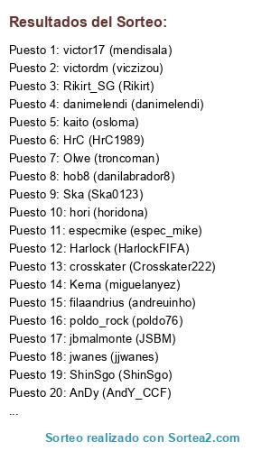 Lista de participantes: Rikirt_SG (Rikirt), poldo_rock (poldo76), lauzi (Gorkalauzi), HrC (HrC1989), cebrii (Cbrii), especmike (espec_mike), filaandrius (andreuinho), AnDy (AndY_CCF), danimelendi (danimelendi), Kema (miguelanyez), hori (horidona), victordm (viczizou), jbmalmonte (JSBM), Harlock (HarlockFIFA), hob8 (danilabrador8), crosskater (Crosskater222), Olwe (troncoman), victor17 (mendisala), jwanes (jjwanes), koblas (koblas73), Ska (Ska0123), spinninglove (Borjszgz), ShinSgo (ShinSgo), kaito (osloma).
