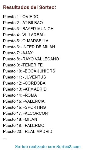 Lista de participantes: -RIVER PLATE, -CORDOBA, -GENT, -VALENCIA, -MILAN, -INTER DE MILAN, -BOCA JUNIORS, -PALERMO, -ELCHE, -OVIEDO, -RCD ESPANYOL, -AJAX, -O.MARSELLA, -PSG, -SPORTING, -AT.MADRID, -SAMPDORIA, -ROMA, -BARCELONA, -VILLAREAL, -MANCHESTER UNITED, -BAYER MUNICH, -REAL MADRID, -TENERIFE, -ALCORCON, -RAYO VALLECANO, -JUVENTUS, -AT.BILBAO.