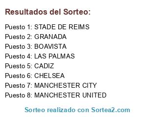 Lista de participantes: GRANADA, MANCHESTER UNITED, BOAVISTA, MANCHESTER CITY, STADE DE REIMS, LAS PALMAS, CHELSEA, CADIZ.