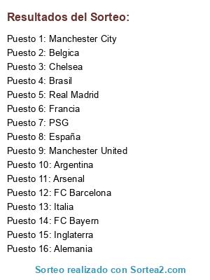 Lista de participantes: Chelsea, Brasil, Arsenal, Francia, Manchester United, Alemania, Belgica, Real Madrid, FC Bayern, Manchester City, Argentina, España, FC Barcelona, Inglaterra, PSG, Italia.