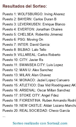 Lista de participantes: ARSENAL: Oscar Millan Sanchez, CHELSEA: Robertito Jimenez, CITY: Javier Rs, MAN U: Alex Sanchez, PSG: Moving On, DORTMUND: Oscar Ugalde, BAYERN: Carlos Duran B, JUVENTUS: Jose Antonio Paul Carrillo, BARSA: Ebed Carrera, MADRID: Miguel Hernández, ATLETICO: Daa Viid Roodrigueez AK, LEVERKUSEN: Enrique Blanco, B. MGLADBACH: Mems Rojo, SHALKE04: Alexis Gonzalez Ochoa, WOLFSBURGO: Irving Alvarez, MONACO: Jaziel Lopez Canuero, MARSELLA LYON: Mike Padu, BILBAO: Lalo Tello, REAL SOCIEDAD: Checo García, SEVILLA: Adrian Antonio Tejeda Velázquez, VALENCIA: Roberto VS, VILLAREAL: Carlos Roberto, EVERTON: Jonathan Chaires, LIVERPOOL: Omar Garcia, NEW CASTLE: Aldair Lozano Mancha, SOUTHAMPTON: Jesus Mora, SPURS: Rod Nava, STOKE CITY: Angel Fdez, SWANSEA CITY: Luis Lopez, MILAN: Alan Chavez, FIORENTINA: Ruben Armando Rodríguez, INTER: David Garcia.