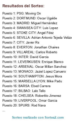 Lista de participantes: ARSENAL: Oscar Millan Sanchez, CHELSEA: Robertito Jimenez, CITY: Javier Rs, MAN U: Alex Sanchez, PSG: Moving On, DORTMUND: Oscar Ugalde, BAYERN: Carlos Duran B, JUVENTUS: Jose Antonio Paul Carrillo, BARSA: Ebed Carrera, MADRID: Miguel Hernández, ATLETICO: Daa Viid Roodrigueez AK, LEVERKUSEN: Enrique Blanco, B. MGLADBACH: Mems Rojo, SHALKE04: Alexis Gonzalez Ochoa, WOLFSBURGO: Irving Alvarez, MONACO: Jaziel Lopez Canuero, MARSELLA LYON: Mike Padu, BILBAO: Lalo Tello, REAL SOCIEDAD: Checo García, SEVILLA: Adrian Antonio Tejeda Velázquez, VALENCIA: Roberto VS, VILLAREAL: Carlos Roberto, EVERTON: Jonathan Chaires, LIVERPOOL: Omar Garcia, NEW CASTLE: Aldair Lozano Mancha, SOUTHAMPTON: Jesus Mora, SPURS: Rod Nava, STOKE CITY: Angel Fdez, SWANSEA CITY: Luis Lopez, MILAN: Alan Chavez, FIORENTINA: Ruben Armando Rodríguez, INTER: David Garcia.