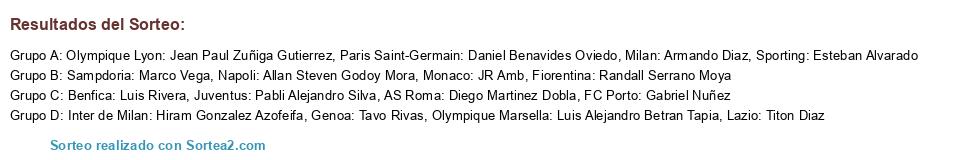 Lista de participantes: Fiorentina: Randall Serrano Moya, Inter de Milan: Hiram Gonzalez Azofeifa, Juventus: Pabli Alejandro Silva, Lazio: Titon Diaz, Milan: Armando Diaz, Napoli: Allan Steven Godoy Mora, AS Roma: Diego Martinez Dobla, Genoa: Tavo Rivas, Sampdoria: Marco Vega, Paris Saint-Germain: Daniel Benavides Oviedo, Olympique Lyon: Jean Paul Zuñiga Gutierrez, Olympique Marsella: Luis Alejandro Betran Tapia, Monaco: JR Amb, FC Porto: Gabriel Nuñez, Benfica: Luis Rivera, Sporting: Esteban Alvarado.